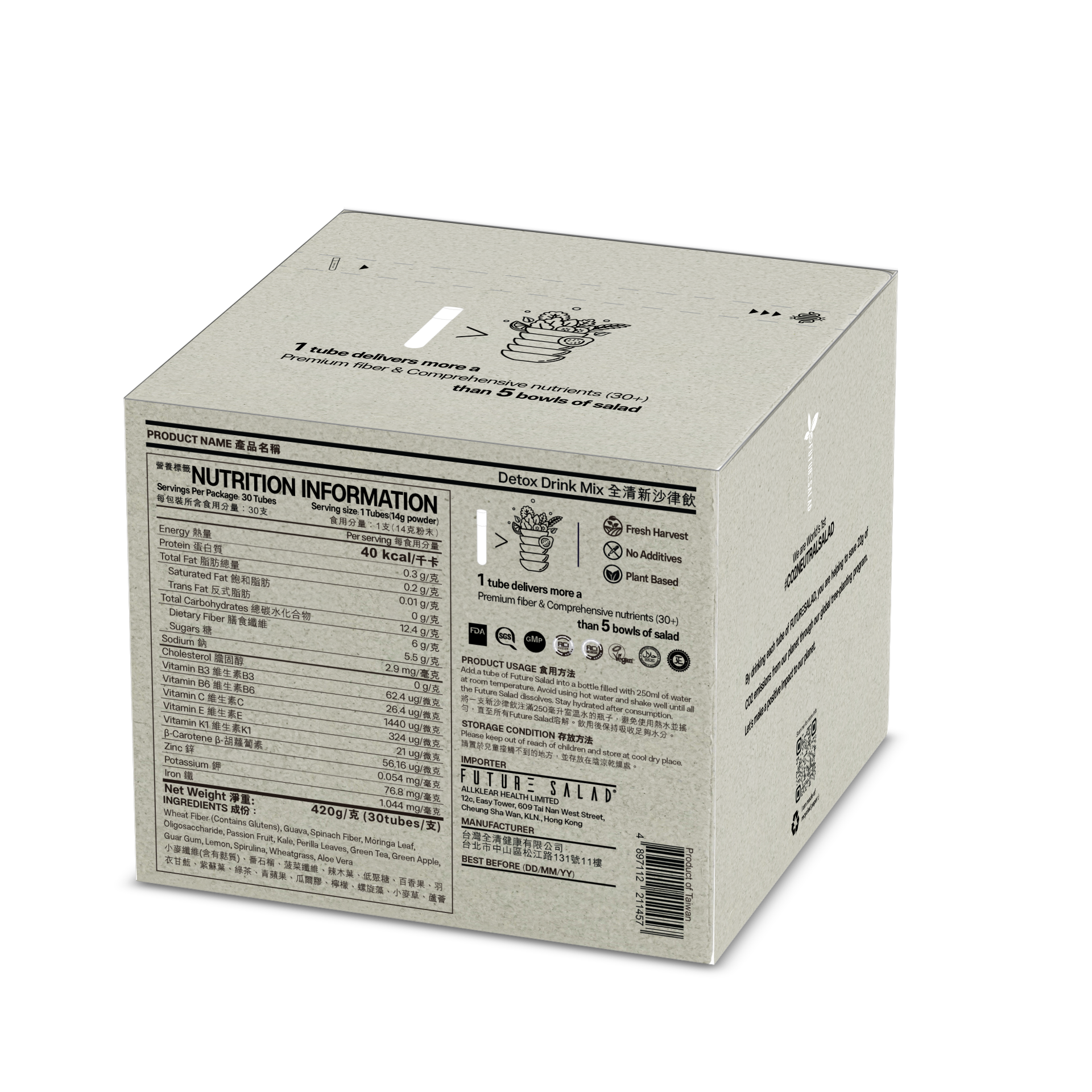 Future Salad Detox Salad Drink Mix 全清新沙律飲 由專業團隊,包括醫生、營養師、科研人員,經過10年時間研的發獨家配方,以太空食品科技「冰結晶昇華乾燥技術」將十多款天然蔬菜轉換成飲用式沙律,全面保留最蔬果營養元素,每日一杯即可補充5碗蔬菜營養及纖維。10秒沖調,高纖排毒。